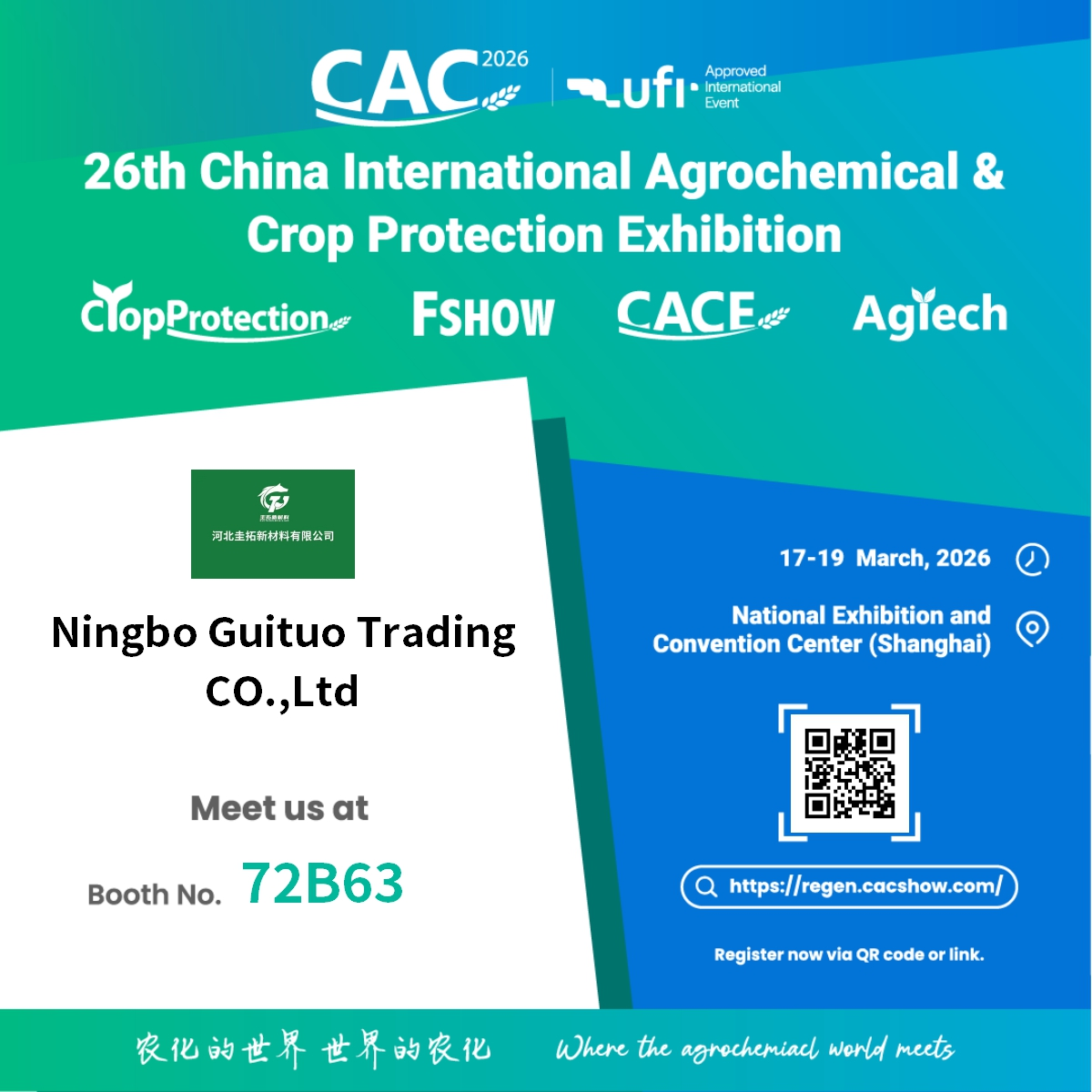 Ningbo Guituo Trading Co., Ltd. è orgogliosa di annunciare la sua partecipazione al 26a Mostra internazionale cinese di prodotti agrochimici e per la protezione delle colture (CAC 2026) . Questo prestigioso evento globale avrà luogo da Dal 17 al 19 marzo 2026 , al National Exhibition and Convention Center di Shanghai.